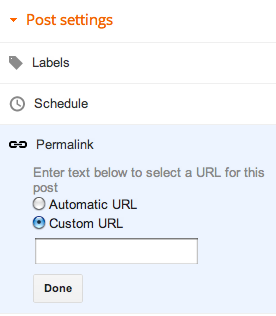 You know the Blogger URL architecture, right? An example is blogname.blogspot.com/2012/7/auto-generated-title-url.html Now with this new addition, you can replace the auto generated URL part with your own custom title URL.